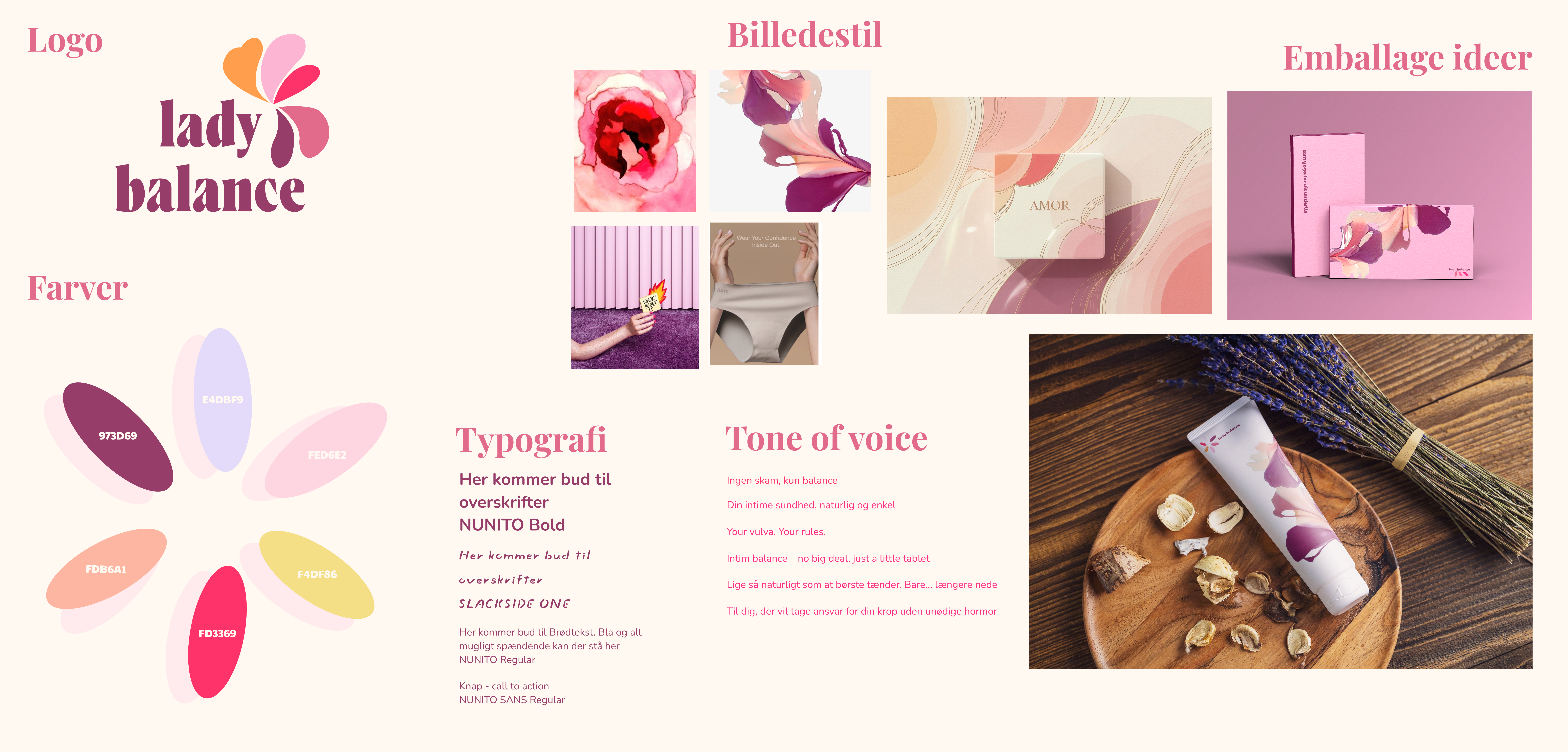 LadyBalance er en dansk virksomhed, der producerer produkter til kvinders intime sundhed. Virksomheden ønskede et rebrand, der kunne modernisere udtrykket, gøre brandet mere relevant for en yngre målgruppe (15–35 år) og samtidig bevare tilliden hos den eksisterende kundebase.